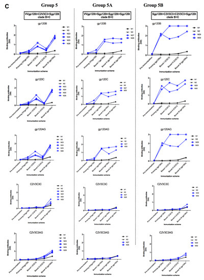 Evolution of the antibody binding responses against soluble gp120ts (clades B, C, CRF02_AG) and C2V3C3 polypeptides (clades C and CRF02_AG) in BALB/c mice immunized with different combinations of HIV-1 immunogens (main study): (A) Mice immunized with clade C immunogens; (B) Mice immunized with clade CRF02_AG immunogens; (C) Mice immunized with clades B (gp120) and C (C2V3C3) immunogens. Groups 3, 4, and 5—mice primed with VV expressing gp120t and boosted with C2V3C3 polypeptides and Sgp120t; Groups 3A, 4A, and 5A—mice primed with VV expressing gp120t and boosted with Sgp120t; Groups 3B, 4B, and 5B—mice primed with Sgp120t and boosted with C2V3C3 polypeptides and Sgp120t. For all mice, the schedule of immunization included one priming and three boosts at days 15, 30, and 45. Fifteen days after each immunization, sera were collected and assayed for the presence of binding antibodies against HIV-1 immunogens. Blue lines represent immunized mice from the respective group; black lines represent mice from control group (G1-M1-M2).