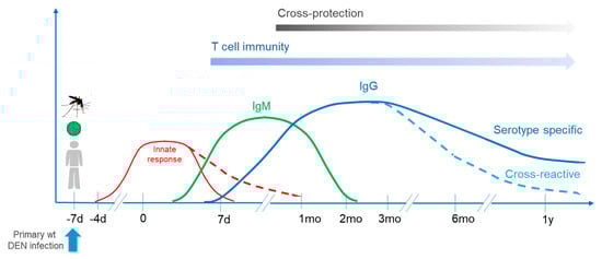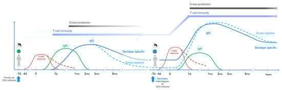 Primary infection with DENV induces potent innate immune responses, which will exert direct antiviral activities and also shape humoral (antibody production by B cells) and cellular (mediated by CD4+ and CD8+ T cells) responses that can be either DENV serotype-specific or cross-reactive against different serotypes (for reviews see [,,]).