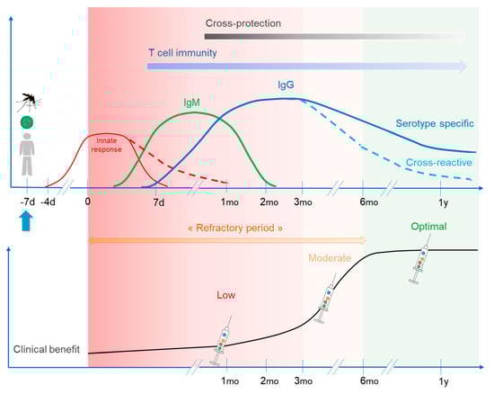 - Innate and adaptive immune responses triggered by dengue wild type infection may induce a “refractory period” during which vaccination efficacy could be limited or even absent