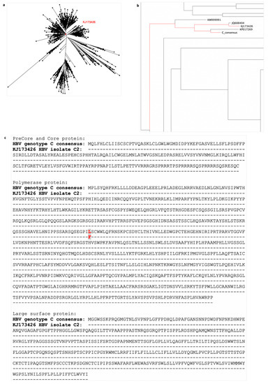 Selection of a patient’s hepatitis B virus (HBV) sequence for HBV genotype C immunogen design. 1447 HBV genotype C whole genome sequences downloaded from hepatitis B Virus database (HBVdb), were aligned using MAFFT and used to generate a consensus sequence for HBV genotype C (phylogenetic tree of all sequences shown in (a). The pairwise distance between each sequence in the alignment and the consensus sequence was calculated. The sequence isolated from a person infected with HBV with the closest amino acid sequence to the consensus was selected (accession number: KJ173426 HBV isolate C2). The phylogenetic tree shows the relationship of the chosen sequence (KJ173426 highlighted red) with all downloaded HBV genotype C sequences in (a) and to other closely related sequences (b). Sequence accession number KP017269 is not derived from an infected person (it is a consensus sequence) and so was disregarded. Alignment of precore/core/polymerase/large-surface protein of the consensus and selected KJ173426 sequence (c) showed one amino acid difference, at positions 321 in polymerase protein (leucine (L) in HBV genotype C consensus and phenylalanine (F) in KJ173426 HBV isolate C2), highlighted by grey box with red letters.