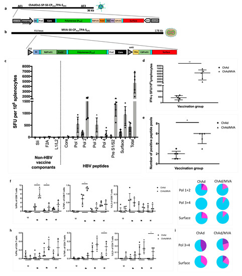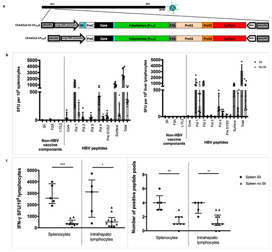 We generated an HBV immunogen with an amino-terminal tethered truncated shark Invariant chain (SIi) to function as a molecular enhancer encoded in ChAdOx2 [26], with a long CMV promoter. Tethering the 26 amino acids of the transmembrane region of SIi to the antigen has been shown to enhance vaccine-induced T cell responses [13]. We compared the capacity of ChAd vaccines with and without SIi, encoding the CPmutS-construct to induce HBV specific T cells (Figure 3a). Lymphocytes were extracted from the spleen and liver 14 days after intramuscular vaccination of outbred CD-1 mice and stimulated with pools of overlapping peptides corresponding to the vaccine immunogen. Lymphocytes from CD-1 mice vaccinated with SIi containing construct showed a significantly higher magnitude of total T cell responses to HBV proteins (median total response 2573 vs. 363 interferon-gamma (IFNγ) spot forming units (SFU) per million splenocytes, p = 0.001, and 3120 vs. 503 IFNγ SFU per million intrahepatic lymphocytes, p = 0.021, Figure 3b,c) and a higher number of positive peptide pools (median 4 vs 1 positive peptide pools in both splenocytes and liver lymphocytes, p = 0.002, Figure 3c). All further immunogens generated hereafter included SIi with the aim of enhancing the magnitude and breath of vaccine induced T cell responses.