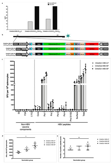 We then compared immunogenicity of the stable vaccine constructs, ChAdOx1-LP-SIi-CPmutTPA-S(sh), ChAdOx1-SP-SIi-CPmutTPA-S(sh), and ChAdOx2-SP-SIi-CPmutTPA-S(sh). To reduce the number of mice required per group in large comparative immunogenicity experiments, we used BALB/c, an inbred mouse strain, for this study. Inbred BALB/c mice intramuscularly vaccinated with ChAdOx1 short-CMV promoter-based SIi-CPmutTPA-S(sh) vaccine induced a higher magnitude of HBV-specific T cells (median total responses of 4231 IFNγ SFU per million splenocytes) compared to the other two stable constructs (median total responses of 2980 and 2024 IFNγ SFU per million splenocytes, *** p < 0.001 for ChAdOx2 short-CMV promoter and ChAdOx1 long-CMV promoter, respectively) (Figure 4c,d). However, there were no differences in the breadth of HBV-specific T cell responses induced by these vaccines (median number of positive peptide pools 2–3 out of 7 possible pools, p = ns, Figure 4e). Based on stability and immunogenicity, ChAdOx1-SP-SIi-CPmutTPA-S(sh) was chosen as the final version for further evaluation.