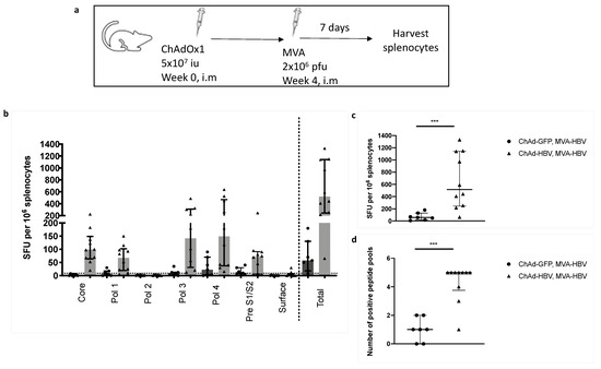 ChAd-MVA prime-boost vaccination in HHD mice induces T-cell response to HBV-core peptides. HHD mice were vaccinated intramuscularly (i.m) with 5 × 107 iu (infectious units) of ChAdOx1-SP-SIi-CPmutTPA-S(sh) or ChAdOx1-GFP as a negative control, followed 4 weeks later by 2 × 106 pfu (plaque forming units) of MVA-SIi-CPmutTPA-S(sh) (a). T cell response magnitude was measured by the number of IFNγ SFU per million lymphocytes 7 days after MVA vaccination and plated in IFNγ ELISpot assays with pools of overlapping peptide corresponding to the vaccine immunogen (b and c) and breath was measured by the number of positive peptide pools (d) (over 20 IFNγ SFU/million cells defined as positive). Median and interquartile ranges are shown. Mann–Whitney tests were used for statistical comparison of medians between groups. *** p < 0.001.