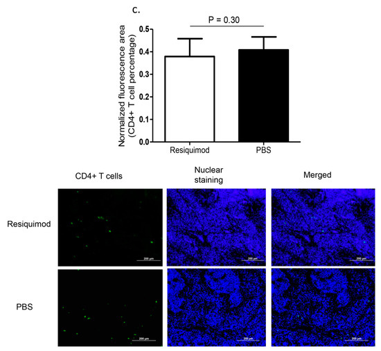 Immunofluorescent assay performed on lung tissue obtained at day one post-hatch, revealed a significant increase in macrophage (p = 0.007, Figure 1a) and CD8α+ T (p = 0.02, Figure 1b) numbers in resiquimod pretreated chickens as compared with the PBS pretreated controls. However, CD4+ T cell numbers were not significantly different between resiquimod and PBS pretreated lungs (p > 0.05, Figure 1c).