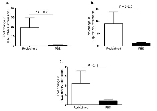 IFN-γ, IL-1β, and iNOS mRNA expression levels following in ovo delivery of resiquimod or PBS. ED18 SPF eggs were treated with resiquimod (n = 6, 400 µg of resiquimod in 200 µL of PBS per egg) or PBS (n = 6, 200 µL of PBS per egg) and incubated to hatch. On the day of hatch, birds were euthanized, and lung tissues collected to assess mRNA expressions of (a) IFN-γ, (b) IL-1β, and (c) iNOS. One-tailed Student’s t-test was performed to identify group differences. The differences were considered significant at p ≤ 0.05. The error bars represent ± SEM.