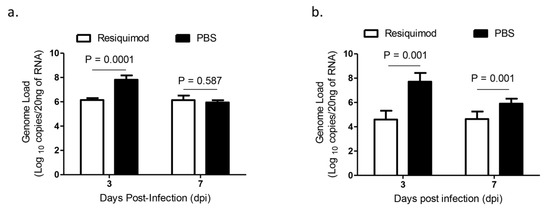 The average IBV viral RNA loads of oropharyngeal and cloacal swabs were lower in resiquimod pretreated chickens at 3 dpi and in cloacal swabs at 7 dpi as compared with that of PBS pretreated chickens (p < 0.001, Figure 3a,b). However, we did not observe a significant difference in oropharyngeal IBV genome loads between the two groups at 7 dpi (p > 0.05, Figure 3a,b).