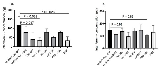 The resiquimod (ssRNA) plus IBV killed vaccine group showed higher IFN-γ concentration which significantly differ (p < 0.05) from IBV killed vaccine alone and control groups in lung (Figure 4a). However, a statistically significant difference between the resiquimod (ssRNA) plus IBV killed vaccine group and the two control groups was not seen although a trend of lower IFN-γ production was seen as compared with the resiquimod (ssRNA) plus IBV killed vaccine group. No significant differences were observed between various groups in spleen (Figure 4b) although the concentrations were found to be higher than in lung.