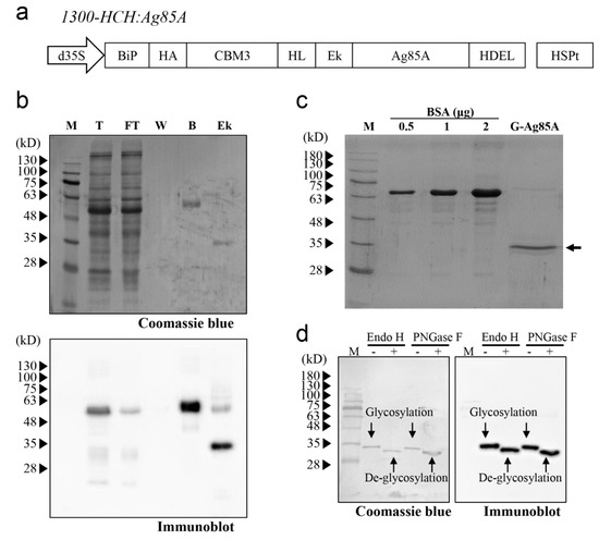 We decided to use N. benthamiana as the host for the production of Ag85A in plants, and we compared the Ag85A produced in N. benthamiana with that expressed in E. coli. Accordingly, Ag85A was codon-optimized to N. benthamiana. Specifically, for the production of recombinant Ag85A in plants, we designed a recombinant Ag85A fusion construct, 1300-HCH:Ag85A (Figure 1a). The construct contained an ER leader sequence that targeted the ER, an HA-tagged CBM3 domain for cellulose-based affinity purification, an HL followed by a enterokinase site to remove the N-terminal region of Ag85A, an Ag85A-coding region, and an ER retention signal to induce accumulation of the recombinant protein in the ER [35,37,38,39]. An HL was introduced between CBM3 and the enterokinase cleavage site to facilitate the access of enterokinase to the target site. HA was added at the N terminus of CBM3 to detect the recombinant Ag85A fusion protein by western blotting using an anti-HA Ab (Figure 1a). Based on the abovementioned design for the Ag85A expression cassette, in vitro enterokinase treatment would produce Ag85A with no additional amino acid residues except the C-terminal HDEL, an ER retention signal [40].
