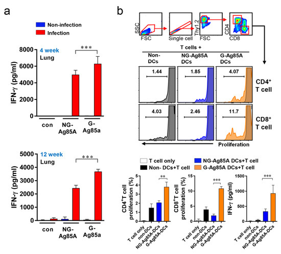 3.2. Glycosylation of Ag85A Induced an Augmented Ag-specific IFN-γ response during Mtb Infection and Increased T Cell Proliferation in Coculture with Bone Marrow-Derived Dendritic Cells