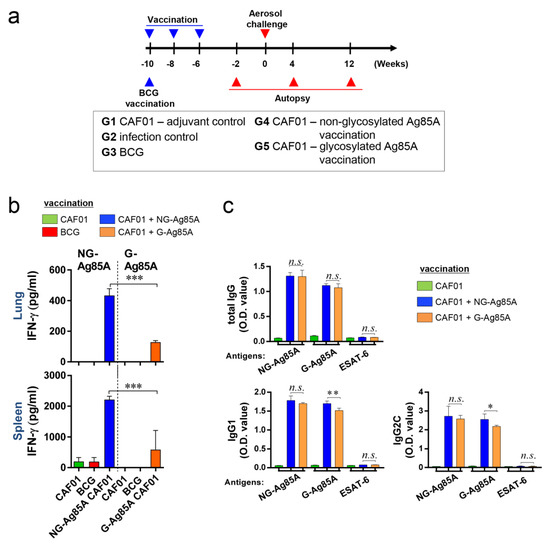 C57BL/6J female mice were subcutaneously immunized once with 2 × 105 CFUs of BCG Pasteur 1173P2. For the subunit vaccine immunization, mice were immunized three times at 2-week intervals via subcutaneous injection. Each immunization contained 2 μg of NG-Ag85A or G-Ag85A protein adjuvanted with CAF01 liposomes. The mice in the control group were immunized with only CAF01. Four weeks after the last immunization, spleen and lung cells were prepared and analyzed in terms of their immunogenicity (n = 4–6 mice/group). Six weeks after the final immunization, the adjuvant control group and the vaccinated groups (BCG, NG-Ag85A, and G-Ag85A) were infected with the Mtb Beijing strain HN878 at approximately 70 CFUs per mouse via aerosol (n = 10–12 mice/group; 5–6 mice/group for each sacrifice time point). Specifically, the mice were exposed to the HN878 strain for 60 min in the inhalation chamber, which had been previously calibrated to deliver a predetermined dose (Glas-Col, Terre Haute, IN, USA). One day after infection, the infected mice were sacrificed to confirm the initial bacterial burden (n = 3). Four weeks and twelve weeks after challenge, mice were sacrificed to measure the efficacy of vaccination.