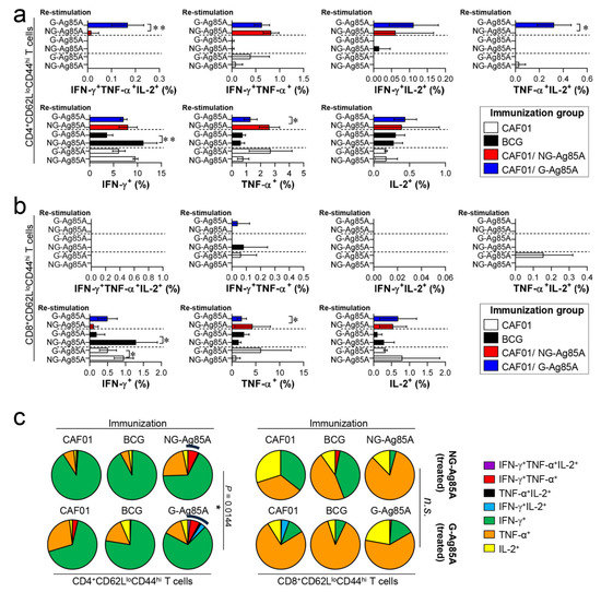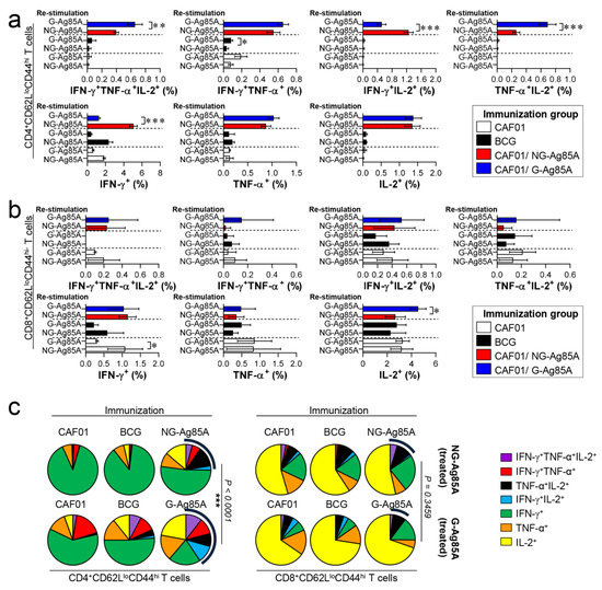 The composition of functional CD4+ and CD8+ T cells is associated with a protective immune response of the host at the time of Mtb infection [43,44]. Among the cytokines secreted from functional T cells, the simultaneous secretion of IFN-γ, TNF-α, and IL-2 from Th1 CD4+ T cells is a crucial component of the protective response against Mtb infection [45]. Therefore, we analyzed a combination of CD4+ and CD8+ multifunctional T cells in the lungs and spleens that secrete IFN-γ, TNF-α, and IL-2. Live individual T cells were gated on CD4+ or CD8+, and triple-positive (IFN-γ+TNF-α+IL-2+), double-positive (IFN-γ+TNF-α+, IFN-γ+IL-2+, TNF-α+IL-2+), and single-positive (IFN-γ+, TNF-α+, IL-2+) T cells were analyzed among the CD62LloCD44hi T cells (Figure S3). Four weeks after the final immunizations, the splenocytes and lung cells of the BCG-, CAF01/NG-AG85A-, and CAF01/G-85A-immunized groups and the CAF01 adjuvant control group were restimulated with NG- or G-Ag85A. The CAF01/G-Ag85A-immunized group tended to show a similar but higher frequency of triple- and double-positive cytokine-secreting CD4+ T cells in the lung than the CAF01/NG-Ag85A-immunized group (Figure 4a,c; left panel). Triple- and double-positive cytokine-secreting CD8+ T cells were barely detected in the lung (Figure 4b,c; right panel). Unlike the lung results, the CAF01/NG-Ag85A- and CAF01/G-Ag85A-immunized groups tended to show a similar frequency of triple- and double-positive cytokine-secreting spleen CD4+ T cells (Figure S4). These results indicated that NG- and G-Ag85A have distinctive immunogenic abilities.