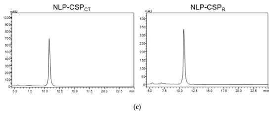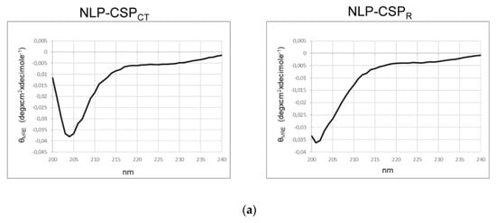 The following estimated percentages of α-helix, β-sheet, and β-turn for each protein were predicted: (i) NLP-CSPCT: 12.4% α-helix, 20.7% anti-parallel β-sheet, 19.5% parallel β-sheet, 22.4% β-turn; (ii) NLP-CSPR: 12.4% α-helix, 20.7% anti-parallel β-sheet, 19.6% parallel β-sheet, 22.5% β-turn. However, the differences in the spectra patterns near 200 nm indicated a higher stability of NLP-CSPCT.