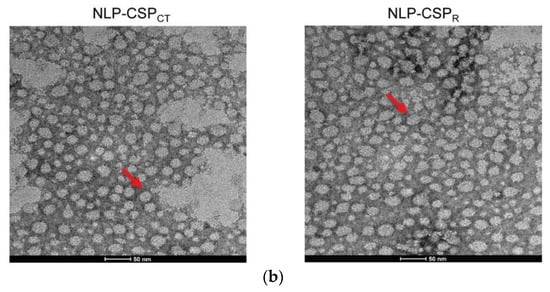 The purified proteins NLP-CSPCT and NLP-CSPR were diluted to the concentration of 2 μg/mL and placed in Formvar/carbon-coated electron microscopy grids (EMS # FCFT200-Cu). The grids were covered and incubated for 20 min in a dry environment. The lower grids were washed for 2 min in distilled water, then in 1% glutaraldehyde (Sigma-Aldrich # G5882) for 5 min and again in water for 2 min. These steps were repeated 7 times. Then, the grids were placed in 50 μL of 4% uranyl acetate (EMS, # 22400) for 7 min. The grids were examined the next day under a transmission electron microscope, Tecnai FEI G20 200 kV, at the Microscopy Center in the Department of Development and Cell Biology at the Biomedical Sciences Institute of the University of São Paulo, under the supervision of Professor Ii-Sei Watanabe.