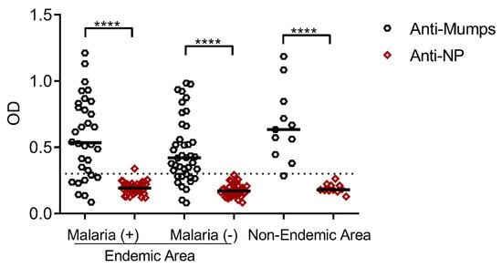 Before the further assessment of NLP-CSPCT immunogenicity, the seroprevalence of antibodies specific to the mumps virus was investigated. Considering the presence of the mumps viral antigen in the described malaria vaccine formulations, this analysis is necessary. Any immunological memory against the mumps virus in the general population (generated by vaccination or natural exposure) could interfere with the immune response against PvCSP as demonstrated with other formulations []. Therefore, we measured the serum antibodies specific to the mumps virus and its NP in individuals from malaria-endemic and non-endemic areas. While most of the subjects tested mumps-positive, demonstrating that most of them had been vaccinated against mumps, the subjects were negative for Mumps-NP (p < 0.0001) regardless of the area of origin or any previous exposure to malaria (Figure 3). This result is in agreement with the low seroprevalence of antibodies specific to Mumps-NP reported previously [].