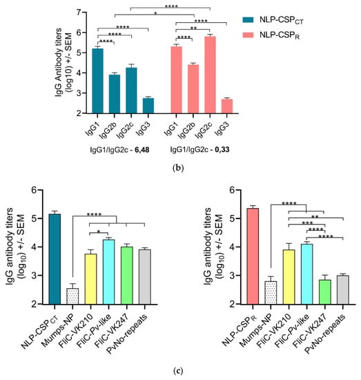The immunogenicity of the recombinant proteins was assessed after their in vivo administration in conjugation with Poly (I:C), a synthetic analog of double-stranded RNA (dsRNA) agonist of TLR3 [] in mice. Each animal received three doses of each protein 14 days apart from each other in a homologous prime-boost vaccination regimen (Figure 4a). When the titers of PvCSP-specific IgG subclasses were evaluated in these groups on day 14 after the second boost, the responses differed significantly. Responses against the NLP-CSPCT protein resulted in predominately IgG1 rather than IgG2c (ratio–6.48), while a balanced ratio between IgG1 and IgG2c was found against NLP-CSPR (ratio: 0.33). When comparing antibody titers of the same subclass, but in the different groups, we observed a significant increase between the IgG2b (p = 0.0279) and IgG2c (p < 0.0001) (Figure 4b). In addition, we evaluated antibody specificity against the homologous proteins that contain the repeat regions of each PvCSP protein variant (FliC’s) [], Mumps-NP protein, the NLP-CSPR and NLP-CSPCT chimeric proteins, and a protein containing the PvCSP non-repeat regions alone (Pv-No repeat) (Figure 4c).