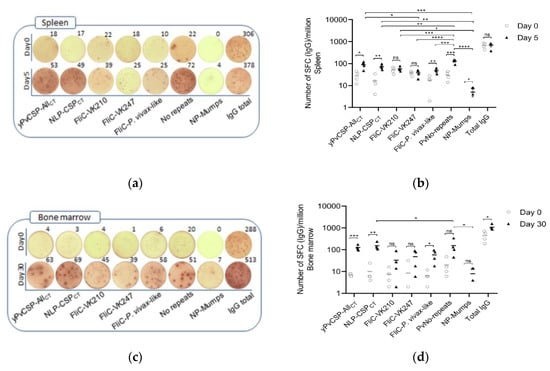 Antibody-secreting cell (ASC) response in NLP-CSPCT-immunized mice. Groups of four C57BL/6 mice were immunized with three doses of NLP-CSPCT conjugated with Poly (I:C) adjuvant. The antigen-specific ASC response in the spleen was measured on days 0 and 5, and in the bone marrow on days 0 and 30 after the last dose. A representative example of the ASC response specific to yPvCSP-AllCT, NLP-CSPCT, FliC-VK210, FliC-VK247, and FliC-P. vivax-like in the spleen is shown in (a), while that of the bone marrow is shown in (c). The wells shown in the figure were plated with 0.5 × 105 cells. The total ASCs were measured for IgG secreting cells specific to the above-mentioned proteins. The data points represent the average ASC counts observed per million cells, while the bars represent the ± SEM (b and d) and frequency (e and f). The results were statistically compared using one-way ANOVA followed by Tukey’s test. Significant differences between groups are denoted on the graph: * p < 0.05, ** p < 0.01, *** p < 0.001, and **** p < 0.0001. Non-significant (ns) differences are indicated (p > 0.05). The experiment was performed twice with four mice per group.