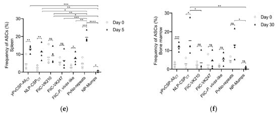 Because we observed high antibody titers to all PvCSP repeat variants in mice immunized with NLP-CSPCT, we performed an ELISPOT assay to evaluate NLP-CSPCT-specific antibody-secreting cell (ASC) generation in the spleen and bone marrow of immunized mice at days 5 and 30, respectively, after the second boost. More specifically, the ELISPOTs were performed against the two chimeric proteins PvCSP-AllCT and NLP-CSPCT, each of the three PvCSP repeat alleles and no-repeat regions, Mumps-NP, and total IgG-secreting cells. We measured ASC frequency in splenocytes 5 days after the second boost, as this is usually the time when their frequency reaches the peak after immunizations []. An increased number of ASCs specific to P. vivax-like repeats (p = 0.0097), the Pv-No repeats (p = 0.0401) portion of the CSP, yPvCSP-AllCT (p = 0.0139), NLP-CSPCT (p = 0.0032), and Mumps-NP (p = 0.0006) was observed in the spleens of immunized mice (Figure 5a,b). However, the number of ASCs specific to VK210 and VK247 was not significantly different from days 0 to 5, nor was the frequency of total IgG secreting cells. By contrast, bone marrow cells were tested for ASCs only 30 days after the second boost, as they take longer to migrate to that location []. An augmented frequency of ASCs specific to the two chimeric proteins PvCSP-AllCT and NLP-CSPCT was found in the bone marrow (Figure 5c,d). Although the third dose increased the overall response to the two chimeric proteins, yPvCSP-AllCT (p = 0.0004) and NLP-CSPCT (p = 0.0031), to P. vivax-like repeats (p = 0.0278) and total IgG (p = 0.0207), no increase in expression was observed in each protein region individually: VK210, VK247, Pv-No repeats, and Mumps-NP. The non-specific responses (total IgG ASCs) were, as expected, the same in both organs regardless of the time after stimuli. The CSP-specific responses accounted for 10% of the total ASCs in the spleen and bone marrow on days 5 and 30 post-stimuli, respectively (Figure 5e,f).