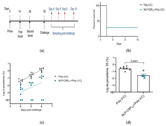 One of the most effective ways to analyze vaccine efficacy is through a challenge test. This approach has been used previously and has proven effective at demonstrating vaccine-induced protection [,,]. However, P. vivax does not infect rodents. Considering that P. berghei is a murine-infecting parasite, we used the chimeric parasite Pb/PvVK210, in which the repeats of the PbCSP were replaced by the PvCSP (VK210), as previously described []. Thus, mice were immunized 3 times with NLP-CSPCT + Poly (I:C) or only the adjuvant. Thirty days later, mice were challenged with 5000 Pb/PvVK210 sporozoites (Figure 6a). Sterile protection was observed in 2 out of 7 mice until day 10 post-challenge, whereas all control mice were infected by day 4 post-challenge (Figure 6b). In addition to the partial sterilizing protection, a ~10-fold decrease in parasitemia on day 5 in the mice immunized with NLP-CSPCT + Poly I:C was observed in comparison to the controls (Figure 6c, p = 0.0012). Moreover, the decrease in parasitemia was still significant in the 5 immunized unprotected mice compared to controls (Figure 6d, p = 0.0051).
