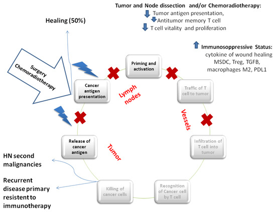 Locoregional treatment and immunity cycle. Locoregional treatment could block the immunity cycle at different level. Primary tumor resection induces a reduction in tumor antigen presentation, T cell activity, and, at the same time, the development of anti-tumor specific memory T cell which is definitively compromised by local lymph nodes dissection. The first postoperative phase is characterized by the increase of cytokines of wound healing, PD-L1 expression, myeloid-derived suppressor cells (MDSC), macrophages M2, and Treg. Similarly, radiotherapy promotes the release of cancer antigen through the induction of immunogenic cell death, increasing the antitumor T cell response and cross antigen presentation. Contemporarily, radiotherapy could promote an immunosuppressive status through the increase of local MDSC, PD-L1 expression, Treg, and macrophages M2. Healing occurs if all neoplastic cells have been radically removed after the intensive multimodal treatment and if micrometastatic disease is completely eradicated. However, head and neck second malignancies could occurr for impaired immunosurveillance. Recurrent disease with a primary induced resistance to immunotherapy is the result of an incomplete and ineffective first immune response.