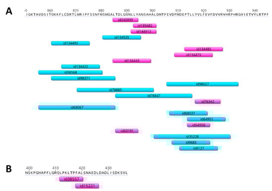 Distribution of the major histocompatibility complex (MHC) class I (purple) and class II (blue) restricted epitopes within the selected AdV cassette. (A) Distribution of human epitopes over the AdV5 hexon fragment (residues 855–935). (B) Distribution of mouse epitopes over the DBP fragment (residues 400–438). The epitope dataset was queried from the Immune Epitope DataBase in February 2020. The alignment was visualized using the Geneious 10.2.5 Software.