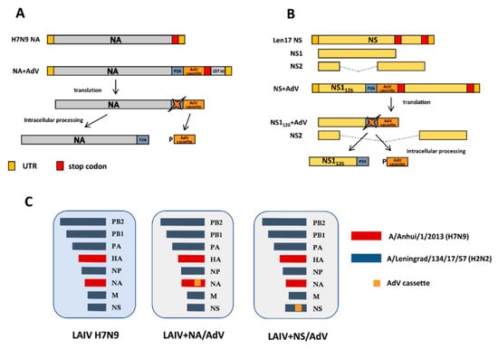 Overview of the designed recombinant influenza viruses. (A). Scheme for generating the chimeric influenza NA gene carrying AdV cassette. (B). Scheme for generating the chimeric influenza NS1 gene-carrying AdV cassette. (C). Genome composition of the live attenuated influenza vaccine (LAIV) viruses. P2A: porcine teschovirus-1 P2A self-cleavage site (GSGATNFSLLKQAGDVEENPG↓P).