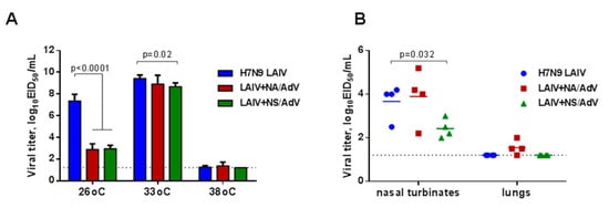 The replicative characteristics of the newly generated recombinant LAIV-AdV viruses were first assessed in eggs at different temperatures, with H7N9 LAIV as a viral vector control. Both LAIV+AdV variants replicated to slightly lower titers in eggs at an optimal temperature of 33 °C than the control virus, but only the LAIV+NS/AdV virus reached statistical significance (Figure 4A). Importantly, the LAIV-AdV recombinant viruses were highly temperature-sensitive, which is a necessary feature of attenuated influenza viruses; however, the cold-adapted phenotype, also typical for LAIV viruses, was impaired in both recombinant strains. Notably, a similar loss of the ca phenotype was observed for other LAIV-based vectored vaccines carrying T-cell epitopes of the respiratory syncytial virus [13]. Nevertheless, both LAIV-AdV vaccine candidates were able to replicate in the upper respiratory tract of C57BL/6J mice (Figure 4B). LAIV+NS/AdV had significantly lower titers in their nasal turbinates than the H7N9 LAIV virus, which is consistent with previous studies that observed that the truncation of the NS1 protein up to 126 amino acids reduced the virus titer in mouse tissues by 100 times [47,48]. Most importantly, neither the LAIV virus tested in this study could actively replicate in the lungs, indicating the attenuated phenotype of the viruses.