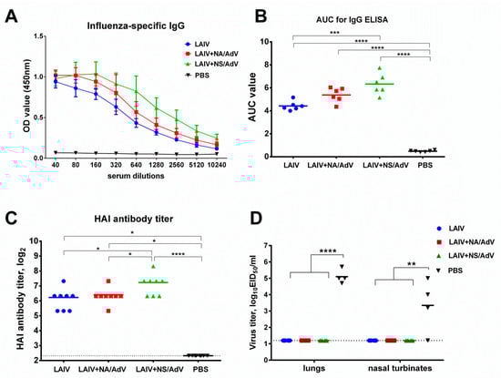 Immunogenicity and protection against influenza virus. (A) Serum influenza-specific IgG measured by ELISA using the whole H7N9 LAIV virus as an antigen. The OD450 values are shown for the indicated serum dilutions (n = 6). (B) The area under the curve values (AUC) for the serum IgG ELISA were calculated for each mouse using the trapezoidal rule. (C) Hemagglutination inhibition titers to the H7N9 LAIV virus (n = 8). (D) Tissues were collected on day 3 after infection with the H7N9-PR8 influenza virus (n = 4). Representative data from two independent experiments are shown. Data were compared using a one-way ANOVA followed by Tukey’s multiple comparison test. The asterisks refer to the level of significance: * p < 0.05, ** p < 0.01; *** p < 0.001, **** p < 0.0001. Dotted lines indicate the limits of viral detection.
