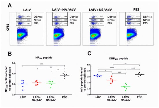 LAIVs are capable of inducing functional cytotoxic T-cell responses in mouse models; therefore, we assessed the ability of the CTLs generated in response to LAIV-AdV immunization to kill target cells loaded with peptides corresponding to the influenza immunodominant epitope (NP366) and the AdV immunodominant epitope (DBP418). A mixture of peptide-loaded and PBS-loaded splenocytes (each population labeled with a unique concentration of CFSE) was administered intravenously to the immunized and control mice, and the number of splenic cells labeled with each CFSE concentration was assessed 18 hours later by flow cytometry (Figure 6A). The killing activity of the cytotoxic T cells induced by all three vaccine viruses was equal to that of the NP366-loaded target cells as the concentrations of these cells were significantly reduced in the vaccinated mice compared to the mock-immunized animals, with no differences observable between the vaccines (Figure 6B). The CTL in vivo assay confirmed that the DBP418 peptide of the human adenovirus (FALSNAEDL) is immunogenic and can induce functional cytotoxic CD8 T cells, which can efficiently kill the peptide-loaded cells in the immune mice (Figure 6C). Strikingly, the LAIV+NS/AdV recombinant virus was significantly more immunogenic against the AdV peptide than its corresponding LAIV+NA/RSV counterpart. As these two recombinant viruses were equally immunogenic with regards to the influenza virus antigen, the superior immunogenicity of the AdV+NS/AdV candidate to the transgene suggests that the expression of the AdV cassette within the truncated NS1 open reading frame can be more advantageous for stimulating T-cell responses to foreign inserts than expression within the NA protein of the influenza virus vector.