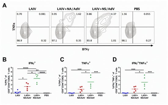 We further assessed the magnitude of recall CD8 T-cell responses in immunized mice upon the AdV5 challenge. Both LAIV-AdV candidates stimulated effector memory T-cell responses, which were recalled shortly after the immunized mice encountered a natural AdV5 infection (Figure 8). Similar to the CTL in vivo results, the LAIV + NS/AdV recombinant virus was significantly more immunogenic than its LAIV+NA/AdV counterpart and resulted in a higher magnitude of recall CD8 Tem responses. Interestingly, the majority of LAIV + NS/AdV vaccine-induced effector memory T cells were characterized by dual cytokine production (IFNγ + TNFα), whereas a lower proportion of the IFNγ-positive Tem cells from the LAIV + NA/AdV test group were also able to secrete TNFα (Figure 8B–D).
