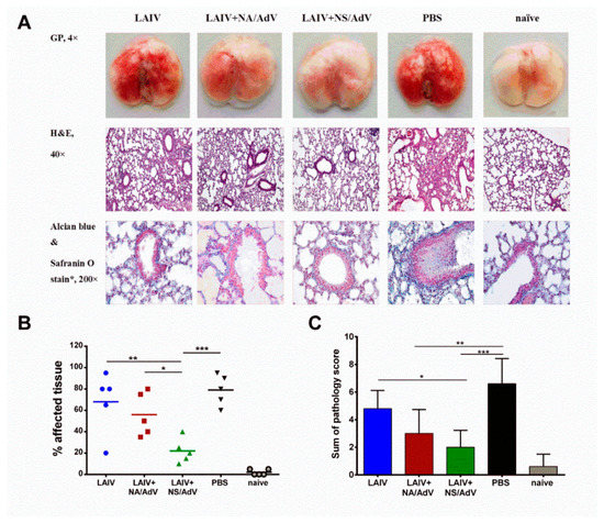 Histopathological evaluation of the lungs of the immunized mice 4 days after AdV5 infection. (A) Representative gross pathology (GP) and histopathology micrographs. H&E: hematoxylin and eosin stain. (B) During dissection, the lungs were examined macroscopically, and an estimate of the percentage of the affected tissue (a bright red color) was recorded. (C) Sum of pathology score is determined based on the degree of bronchiolar epithelial cell damage, as well as the extent of alveolar, perivascular, and peribronchial infiltrations. The data were compared using a one-way ANOVA followed by Tukey’s multiple comparison test. The asterisks refer to the level of significance: * p < 0.05, ** p < 0.01, and *** p < 0.001.