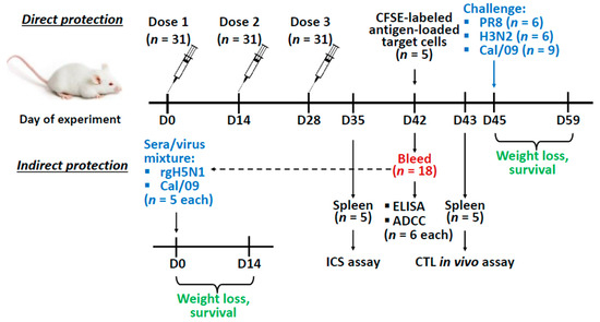 Overview of the mice study design. Mice were immunized with the recombinant vaccine prototypes three times with a two-week interval. Two weeks after the last immunization mice were bled to assess antibody titers and antibody-dependent cellular cytotoxicity (ADCC) (n = 6 for each), and to test the indirect protection of immune sera. For the in vivo indirect protection experiment, naïve mice were inoculated with 1:1 sera/virus mixture (3 × LD50 of rgH5N1 or Cal/09 (n = 5 for each)) and monitored daily for weight loss and survival for 14 days. In addition, on day 35 and 43 spleens (n = 5) were collected for the intracellular cytokine staining (ICS) assay or cytotoxic T-lymphocyte (CTL) in vivo assay respectively. On day 45 immunized mice were infected with a lethal dose of challenge virus (3 × LD50 of either PR8 or H3N2 (n = 6 for each), or 30 × LD50 Cal/09 virus (n = 9)) and monitored daily for weight loss and survival for 14 days.