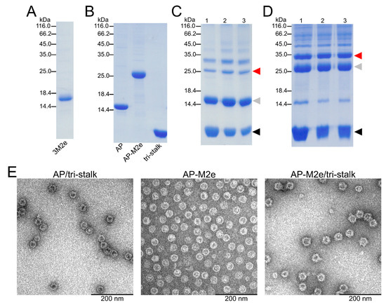 Characterization of recombinant protein constructs produced in E. coli. The purity of recombinant proteins—(A) 3M2e, (B) AP205, AP-M2e, and tri-stalk—was analyzed in SDS/PAGE under reducing conditions. Hemagglutinin (HA) tri-stalk protein was then coupled to the surface of (C) AP205 VLPs and (D) AP-M2e VLPs and subsequently analysed in SDS/PAGE under reducing conditions: lane 1—immediately after coupling; lane 2—after Amicon Ultra 4 filtration; lane 3—after freeze-thawing. Red arrow refers to the coupling zone, grey arrow—coat protein monomer, black arrow—tri-stalk protein. Coupling bands indicate a successful reaction. (E) Electron microscopy images of chimeric particles after freeze-thawing.