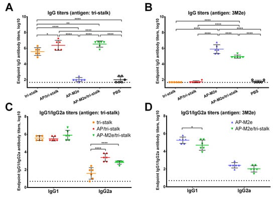 Immunogenicity of the recombinant vaccine candidates included in the study. Serum IgG antibodies from BALB/c mice (n = 6) immunized with vaccine candidates were tested by ELISA for their binding activity against the proteins included in the vaccine candidates: (A) IgG antibody binding to the tri-stalk protein; (B) IgG antibody binding to the 3M2e protein; (C) IgG1/IgG2a subclasses binding to the tri-stalk protein; (D) IgG1/IgG2a subclasses binding to the 3M2e protein. The dotted line indicates the limit of antibody detection; error bars represent mean ± SD. Statistical analysis was performed using one-way ANOVA (A–B) or two-way ANOVA (C–D) followed by a Tukey’s multiple comparison test (* p < 0.05; ** p < 0.01; *** p < 0.001; **** p < 0.0001).