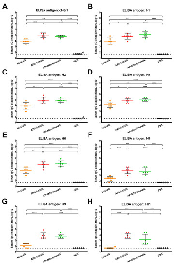 Cross-reactivity of the recombinant vaccine candidates against group 1 hemagglutinins. Breadth of the antibody response elicited by the immunization of BALB/c mice (n = 6) with the vaccine prototypes was determined by ELISA against a panel of full-length recombinant HA proteins: (A) cH6/1—head domain from H6N1 A/mallard/Sweden/81/2002 virus and stalk domain from H1N1 A/California/04/2009 virus; (B) H1N1 A/Solomon islands/03/2006; (C) H2N2 A/Japan/305/1957; (D) H5N1 A/Indonesia/5/2005; (E) H6N4 A/mallard/Sweden/81/2002; (F) H8N4 A/mallard/Sweden/24/2002; (G) H9N2 A/guinea fowl/Hong Kong/WF10/1999; (H) H11N9 A/shoveler/Netherlands/18/1999. The dotted line indicates the limit of antibody detection; error bars represent mean ± SD. Statistical analysis was performed using one-way ANOVA followed by a Tukey’s multiple comparison test (* p < 0.05; ** p < 0.01; *** p < 0.001; **** p < 0.0001).