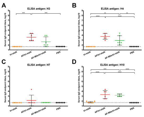 Cross-reactivity of the recombinant vaccine candidates against group 2 hemagglutinins. Breadth of the antibody response elicited by the immunization of BALB/c mice (n = 6) with the vaccine prototypes was determined by ELISA against a panel of full-length recombinant HA proteins: (A) H3N2 A/Wyoming/3/2003; (B) H4N6 A/red knot/Delaware/541/1988; (C) H7N9 A/Shanghai/1/2013; (D) H10N8 A/Jiangxi-Donghu/346/2013. The dotted line indicates the limit of antibody detection; error bars represent mean ± SD. Statistical analysis was performed using one-way ANOVA followed by a Tukey’s multiple comparison test (** p < 0.01; *** p < 0.001; **** p < 0.0001).