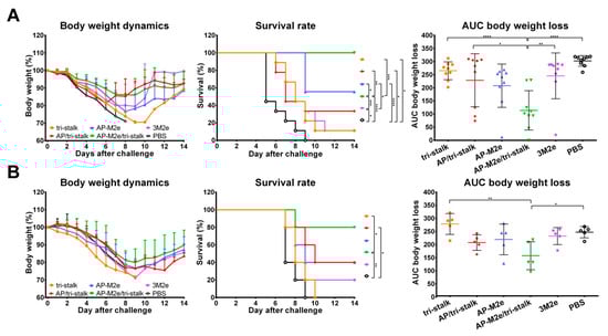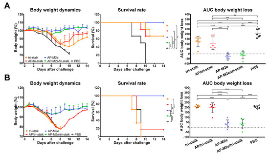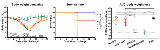 Vaccinated mice were challenged with 30 × LD50 of the Cal/09 virus. Antibody responses induced by all five vaccine candidates delayed the infection and significantly improved the survival rates of mice after infection (Figure 9A). However, the tri-stalk protein, AP/tri-stalk, AP-M2e, and 3M2e vaccine prototypes did not protect animals from a significant weight loss, and only 11.1–55.6% of mice survived the infection. In contrast, an impressive 100% survival was achieved in the AP-M2e/tri-stalk group, with no significant weight loss observed. Noteworthy, the AP-M2e/tri-stalk vaccine afforded significantly better protection against this challenge than the AP-M2e vaccine.