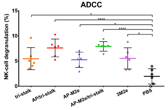 Levels of ADCC were measured by determining degranulation activity of mouse NK-cells under the influence of the immune sera. NK-cells recognize viral antigens on the surfaces of virus-infected cells and directly induce their clearance [39]. MDCK cells expressing Cal/09 viral proteins were used as target cells capturing virus-specific antibodies from immune sera. The NK-cell degranulation induced by the Fc-domains of the captured antibody was assessed by flow cytometric analysis. All five vaccine prototypes induced significant degranulation by NK-cells (Figure 10), however, more distinct ADCC activity was seen for the AP/tri-stalk and AP-M2e/tri-stalk immune sera. Although the difference between the AP-M2e and AP-M2e/tri-stalk groups was not significant by the ANOVA test, a direct comparison of these groups using a non-parametric Mann–Whitney U test revealed a strong significance (p = 0.0087), suggesting that the tri-stalk targeted antibodies possess stronger ADCC activity than the M2e-targeted antibody.