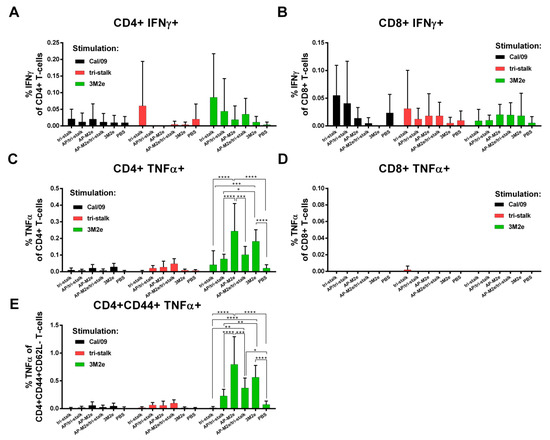 T-cell responses of immunized mice. BALB/c mice (n = 5) were immunized with recombinant vaccine candidates to measure the levels of virus/protein-specific T-cell responses by intracellular cytokine staining assay: (A) IFNɤ-secreting CD4+ T-cell responses; (B) TNFα-secreting CD8+ T-cell responses; (C) TNFα-secreting CD4+ T-cell responses; (D) IFNɤ-secreting CD8+ T-cell responses; (E) TNFα-secreting effector memory CD4+ T-cell subsets (CD44+CD62L−). Error bars represent mean ± SD. The T-cell levels were compared using two-way ANOVA followed by a Tukey’s multiple comparison test (* p < 0.05; ** p < 0.01; *** p < 0.001; **** p < 0.0001).