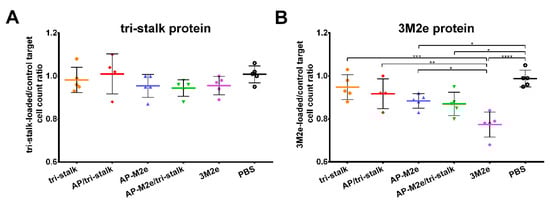 In vivo cytotoxicity of the T-cells in immunized mice. Cytotoxic activity of the induced T-cell immune responses was measured in BALB/c mice (n = 5) after immunization with recombinant vaccine candidates: (A) tri-stalk loaded target cells; (B) 3M2e loaded target cells. Error bars represent mean ± SD. The proportions of protein-loaded to the PBS-loaded target cells between the vaccine groups were compared using one-way ANOVA followed by a Tukey’s multiple comparison test (* p < 0.05; ** p < 0.01; *** p < 0.001; **** p < 0.0001).