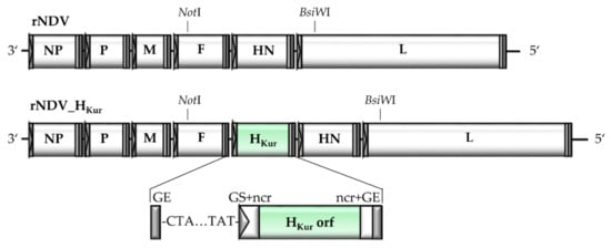Recombinant NDV_HKur harbors a transgene encoding the H orf of virulent PPRV strain Kurdistan, isolated in 2011 from clinically ill wild goats in the Kurdish region of Iraq. It was assigned to lineage IV [70,74]. The foreign gene was inserted into the intergenic region of F and HN genes of lentogenic NDV strain Clone 30 (rNDV) with appropriate gene start, gene end and non-coding sequences derived from the NDV HN gene (Figure 1).