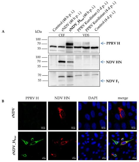 Expression of PPRV H was investigated by Western blot analyses of CEFs, infected with parental rNDV and newly generated rNDV_HKur. The α PPRV-H serum detected PPRV H with a molecular mass of about 70 kDa but did not react with NDV proteins or uninfected cells (Figure 2A). VDS cells infected with PPRV Kurdistan/11 verified the specificity of the signal. A signal of about 65 kDa was detected in all samples, which was classified as an unspecific reaction of the antiserum with cellular components. Expression of NDV subunit F1 (~55 kDa) and HN (~70 kDa) could be confirmed in NDV-infected CEFs but, as expected, not in PPRV-infected VDS cells (Figure 2A).