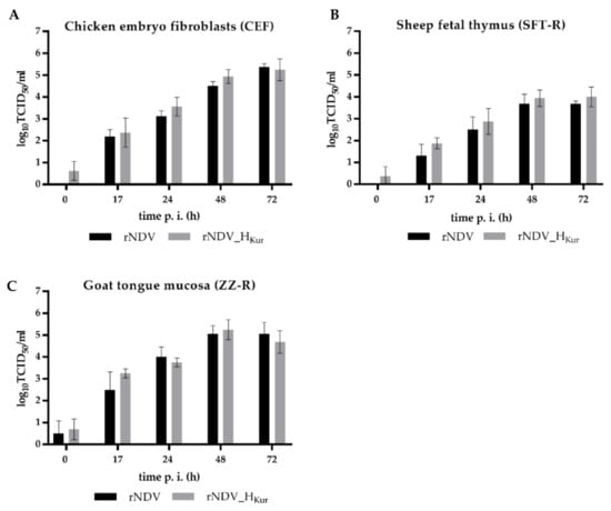 Replication of rNDV_HKur and parental rNDV was investigated in avian cell lines of NDV host species (CEF, QM9) and in two mammalian cell lines of PPRV host species (SFT-R and ZZ-R). Both viruses were able to replicate in chicken fibroblasts (Figure 3A), but also in ovine thymus cells (Figure 3B) and caprine mucosal tongue cells (Figure 3C) with very similar titers. Final virus titers were about 105 TCID50/mL in CEF and ZZ-R cells and about 1 log10 lower in SFT-R cells 72 h p.i.