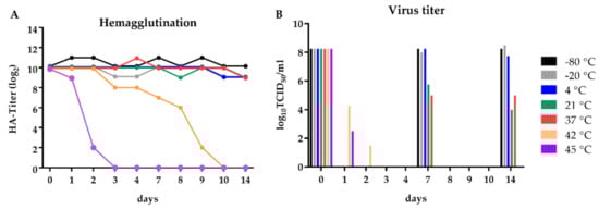 The HA titer remained stable at about 210 for the observation period of 14 days at temperatures between −80 °C and 37 °C (Figure 4A). At 42 °C, the HA titers remained high between 210 and 28 for four days and dropped to 0 after ten days of incubation, whereas no HA activity was detectable at 45 °C already after three days.