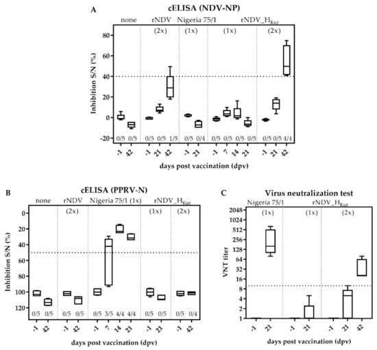 Serology after vaccination. Five goats each were either left unvaccinated (group 1), double inoculated with rNDV (group 2), single vaccinated with PPRV Nigeria 75/1 (group 3), single vaccinated with rNDV_HKur (group 4), or double vaccinated with rNDV_HKur (group 5). Sera were taken at indicated days after vaccination (dpv) and analyzed for the presence of antibodies, specific to either (A) NDV NP or (B) PPRV N by competitive ELISA (cELISA). A dotted line indicates the respective thresholds. The number of seropositive tested samples and the number of total tested samples are given below the boxplots. (C) Sera from goats, vaccinated with PPRV Nigeria 75/1 and rNDV_HKur, were tested for the presence of neutralizing antibodies against PPRV Nigeria 75/1 by virus neutralization test (VNT). Sera exhibiting a VNT-titer >10 are considered seropositive (dotted line).