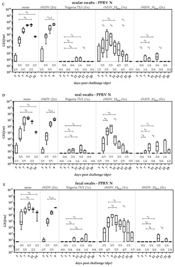 Blood, nasal swabs, ocular swabs, oral swabs, and fecal swabs were taken from all animals 3, 5, 7, 9, 11, 14, 17, 21, and 28 days post challenge (dpc) to monitor viremia, shedding, and replication of the challenge virus. Sera for analyses of PPRV and NDV specific antibodies were taken on the same days.