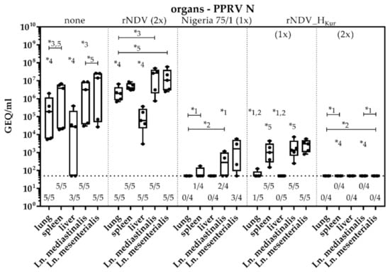 In contrast, all non-immunized and rNDV-inoculated control goats developed PPR specific clinical signs including fever, as has been described for this isolate in German domestic goats before (Figure 6A,B,F,G) [70]. All control animals developed viremia, the challenge virus was shed in high amounts, detected by high viral loads in all swabs, and the animals were euthanized 9 or 14 dpc, as they had reached the humane endpoint (Figure 7). As expected, no significant differences were observed between non-vaccinated and rNDV-vaccinated animals, regarding the disease pattern. As morbilliviruses exhibit a pronounced lymphotropism [79], detection of PPRV RNA postmortem was most abundant in lymphatic tissue of the spleen and investigated lymph nodes. Additionally, the lungs as targets of primary PPRV infection were strongly positive and the liver could be identified as a site of viral replication (Figure 9).