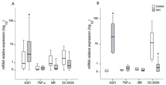 Differentiation markers in ovine myeloid cells infected with Sendai virus (SeV). Relative expression of M1 (A3Z1, TNF-α) and M2 (MR, DC-SIGN) differentiation markers measured in alveolar macrophages (A) and blood derived macrophages (B). Values are the median (±interquartile range) of at least three independent experiments. * p < 0.05 (paired Mann–Whitney U Test).