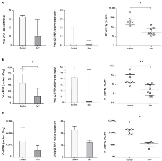 As the M1 differentiation pathway has been reported to inhibit SRLV infection, AMs from naturally SRLV-infected animals were infected with SeV and checked for SRLV viral DNA and RNA as well as RT activity in the supernatant. SRLV viral DNA and p25 gene expression were non-significantly reduced (p = 0.24 and p = 0.31, respectively), however, viral production was significantly (p < 0.05) inhibited in AM; Figure 3A.