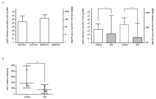Pseudotyped Human Immunodeficiency virus (HIV-1) restriction after Sendai virus (SeV) infection. ((A), left panel) HIV-1-GFP proviral load in ovine skin fibroblasts (OSFs; left axis) and blood-derived macrophages (BDMs; right axis) infected with HIV-1 GFP-based vector or SeV-infected. Values represent the geometric mean copy values (±95% confidence interval (CI)) per 100 ng of total DNA. ((A), right panel) GFP proviral copies measured in uninfected and SeV-infected OSF and BDM transduced with HIV-1 GFP vector. Values are the geometric mean copies (±95% CI) per 100 ng of total DNA. Differences were statistically analyzed using unpaired T test (one-tailed), * p < 0.05. (B) Relative infectivity in 293-T cells of HIV-1-GFP pseudovirus produced in uninfected 293-T cells (control; white bars) or infected with SeV (SeV; grey bars) in fresh 293-T cells. Values are the geometric mean (±95% CI) of at least three independent experiments. Differences were statistically analyzed using paired T test (one-tailed), * p < 0.05, ** p < 0.01.