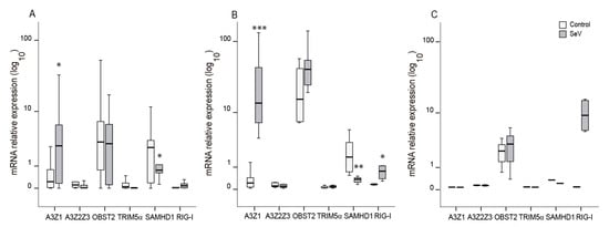Lentiviral restriction factors mRNA expression in ovine cells after infection with Sendai virus (SeV). Ovine APOBEC3 proteins (A3Z1 and A3Z2Z3), tetherin (OBST2), TRIM5α, SAMHD1, and RIG-I mRNA expression was quantified in control (white) and SeV-infected (grey) ovine alveolar macrophages (A), blood derived macrophages (B), and skin fibroblasts (C). Values are the median (±interquartile range) of at least three independent experiments, * p < 0.05, ** p < 0.01, *** p < 0.001 (paired Mann-Whitney U test).